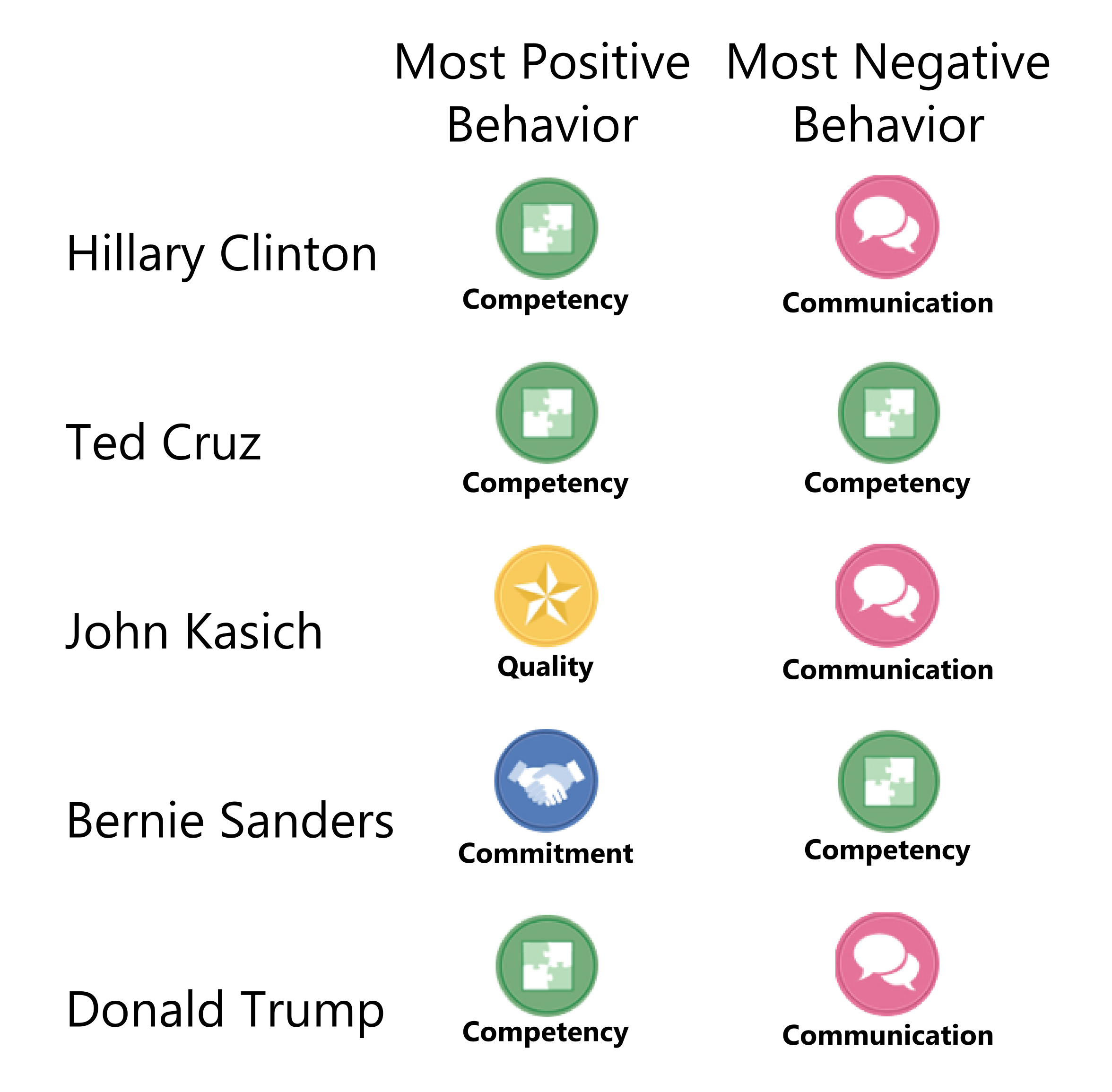 The Reputada Presidential Election Poll provides unique insight into how business managers and owners view the candidates. For example, the first graphic shows how business people rated behaviors of each of the candidates. These are the behaviors that got the most positive or negative votes for each candidate: