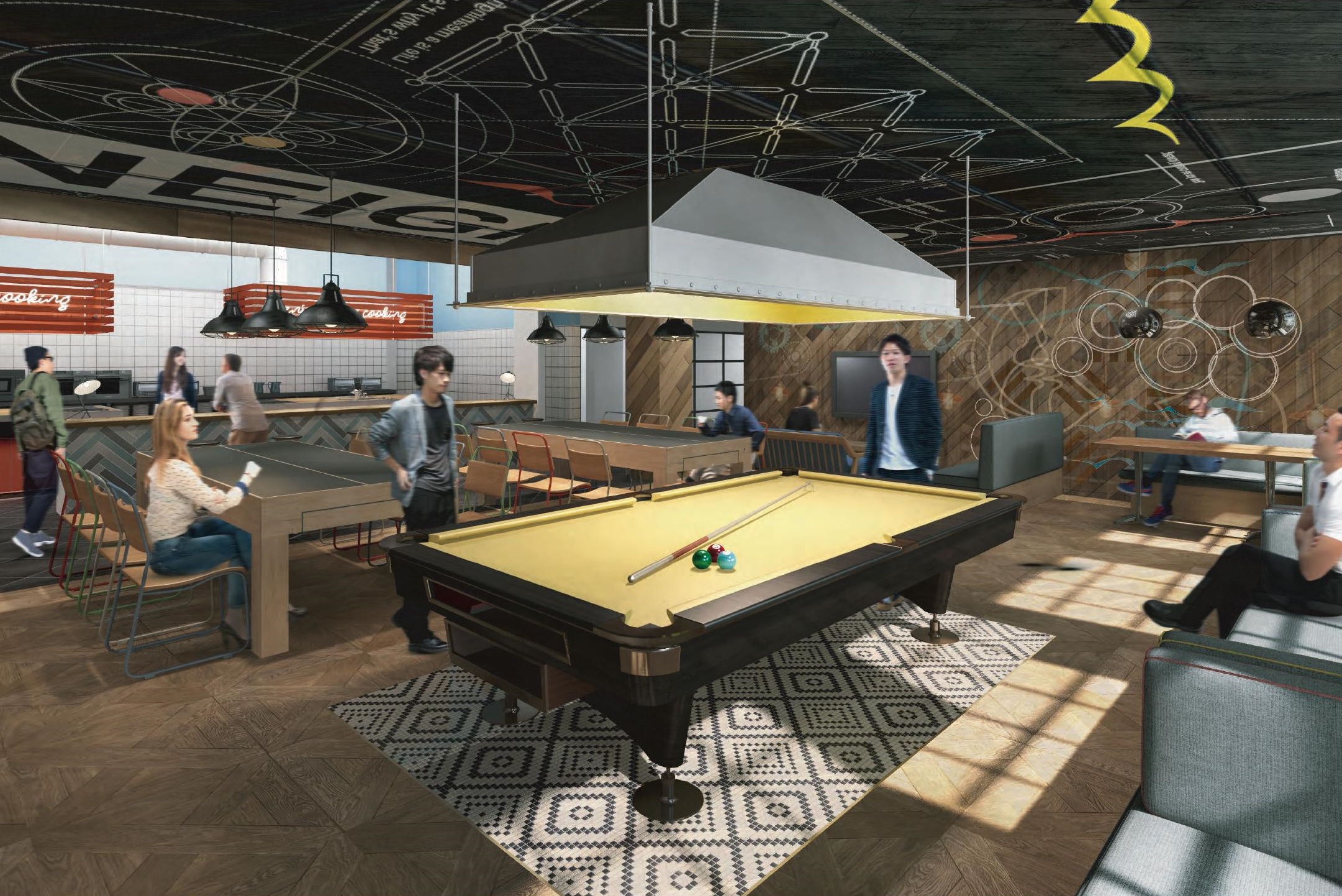 The lounge combines chic modern elements with designs that express Osaka's unique energy to provide a lively yet comfortable space. It is easy to imagine residents cooking at one of the many island kitchen stations, playing pool, or eating at one of the adjacent booths or tall countertop tables located towards the back of the spacious 150m² lounge while chatting with other residents who have just returned home from work.