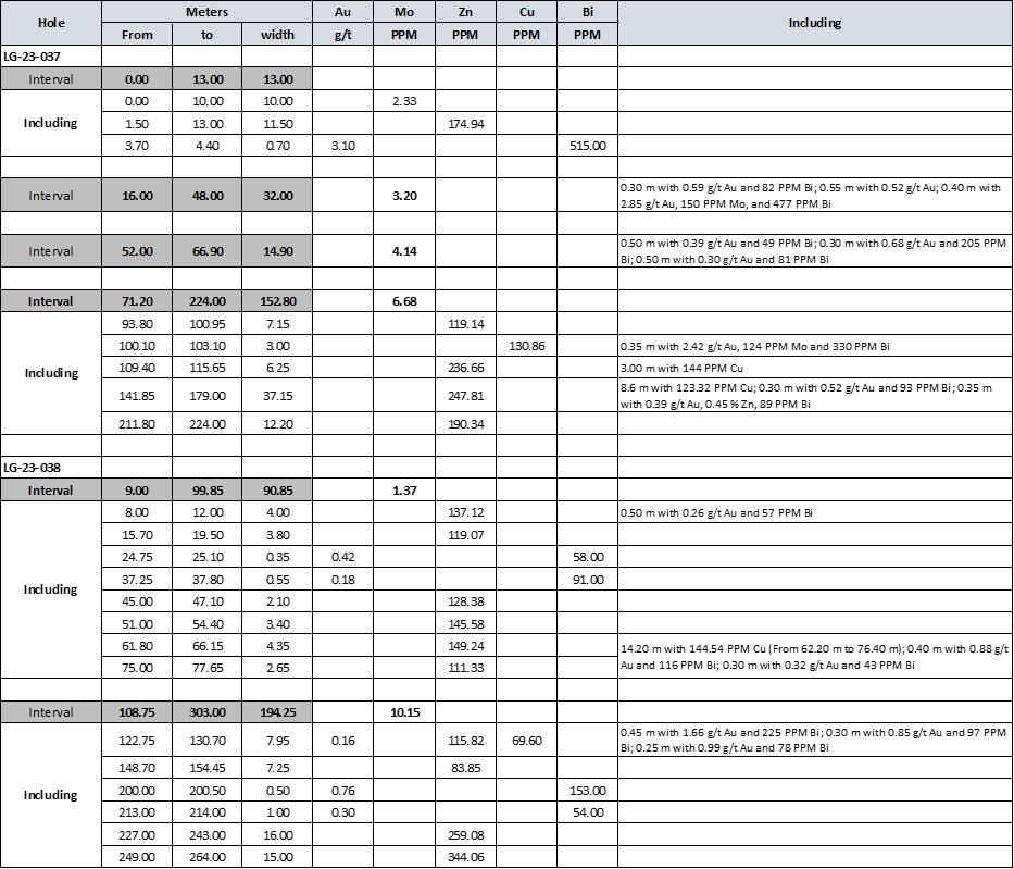 - LG-23-40: 19.05m of 0.76 g/t Gold
