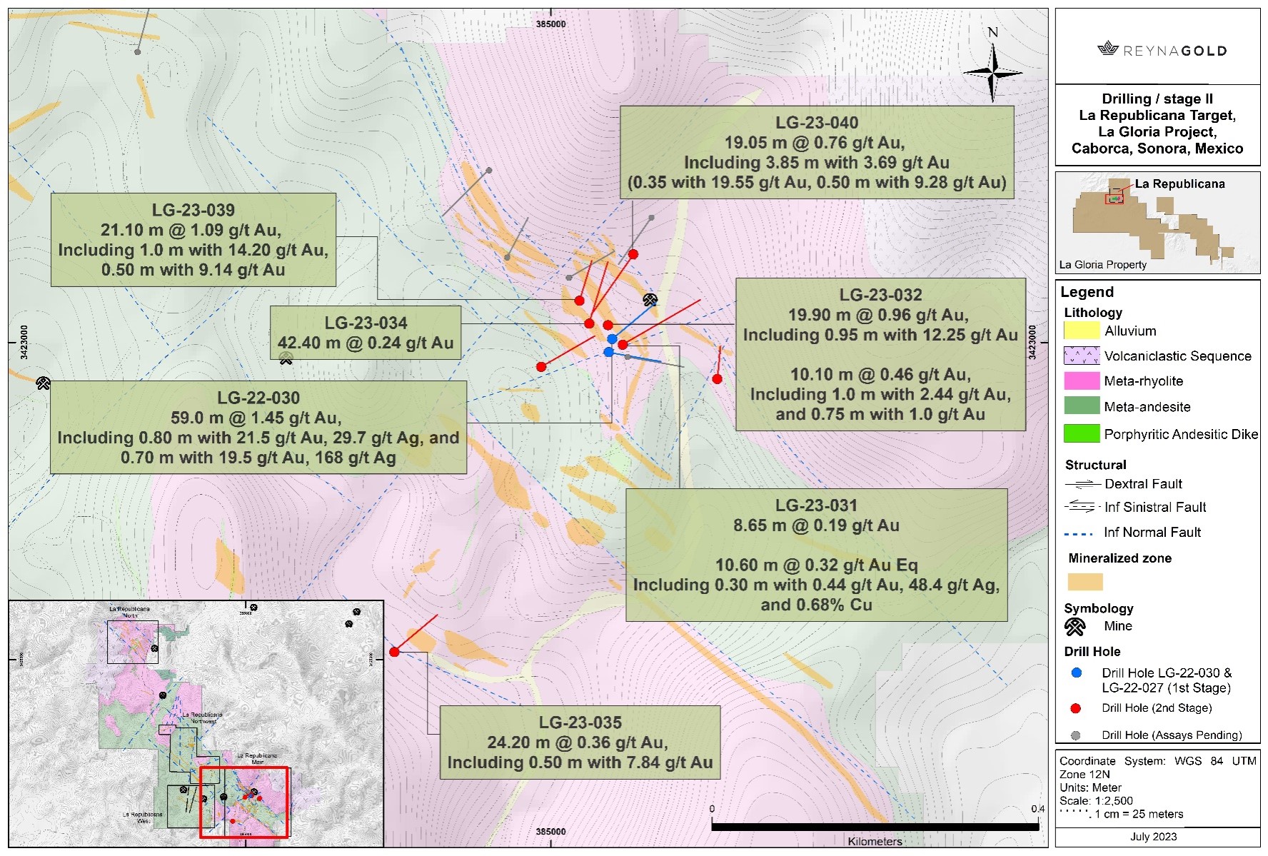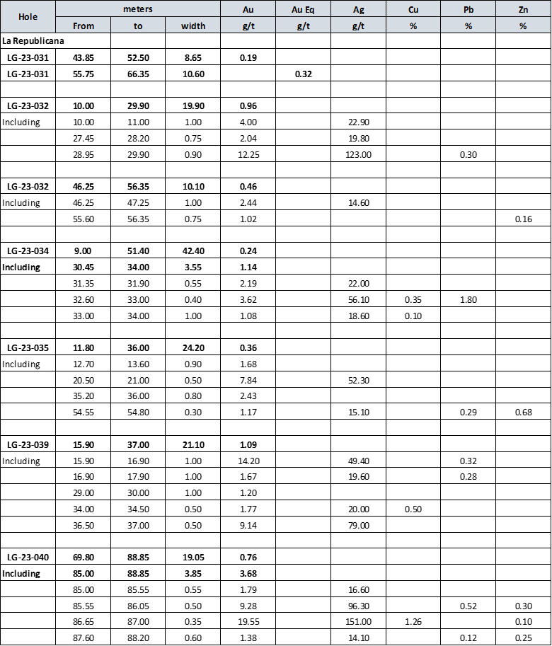 The first goal of Phase 2 drilling at La Republicana is to step out from drill hole LG-22-30 and delineate the extent of the disseminated gold system. Eight out of these first ten drill holes for a total of 801m have been targeted towards this goal and have successfully started to delineate a mineralized zone of approximately 200m by 150m around LG-22-30, with a combination of gold-bearing quartz veins and disseminated gold mineralization in meta-rhyolite and meta-andesite.