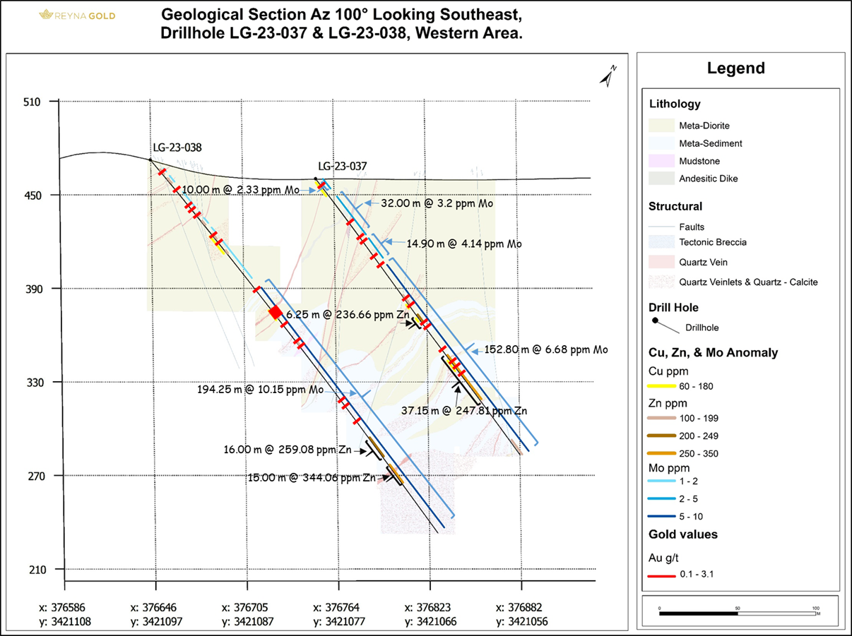 Results confirm the presence of several geochemical indicators that the drill holes (LG-23-37 and LG-23-38) are in close proximity to a porphyry: high levels of pyrite, pyrrhotite, and chalcopyrite (sulfides), along with long intersections of anomalous grades of Zinc, Molybdenum; and Bismuth highly correlated with Gold (see Figure 3), add to the geophysical anomaly that has been identified (see Figure 2).
