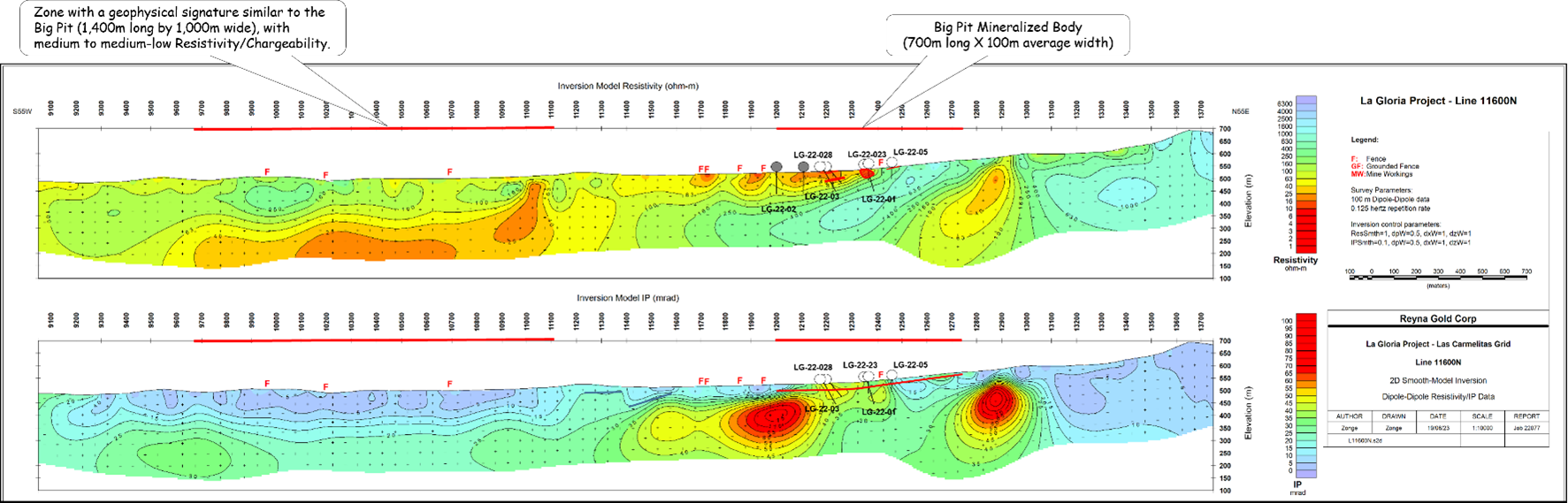 The Induced Polarization geophysical survey carried out in the Las Carmelitas-Big Pit areas observed a similar geophysical signature, observed between these two areas, with the anomaly at depth in Las Carmelitas substantially bigger, approximately 1,400 m length by 1,000 m width and below conglomerate zone (see Figure 4). It also coincides with the large silica alteration identified by Aster and Worldwide 3 satellite imaging and the potential supergene enrichment zone within the conglomerate.