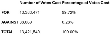 The special resolution approving the Transaction (the " Arrangement Resolution ") required the approval of two-thirds of the votes cast by REYG Shareholders, present in person or represented by proxy at the Special Meeting. The Arrangement Resolution was approved by a significant majority of votes cast at the Special Meeting. The table below summarizes the voting results on the Arrangement Resolution: