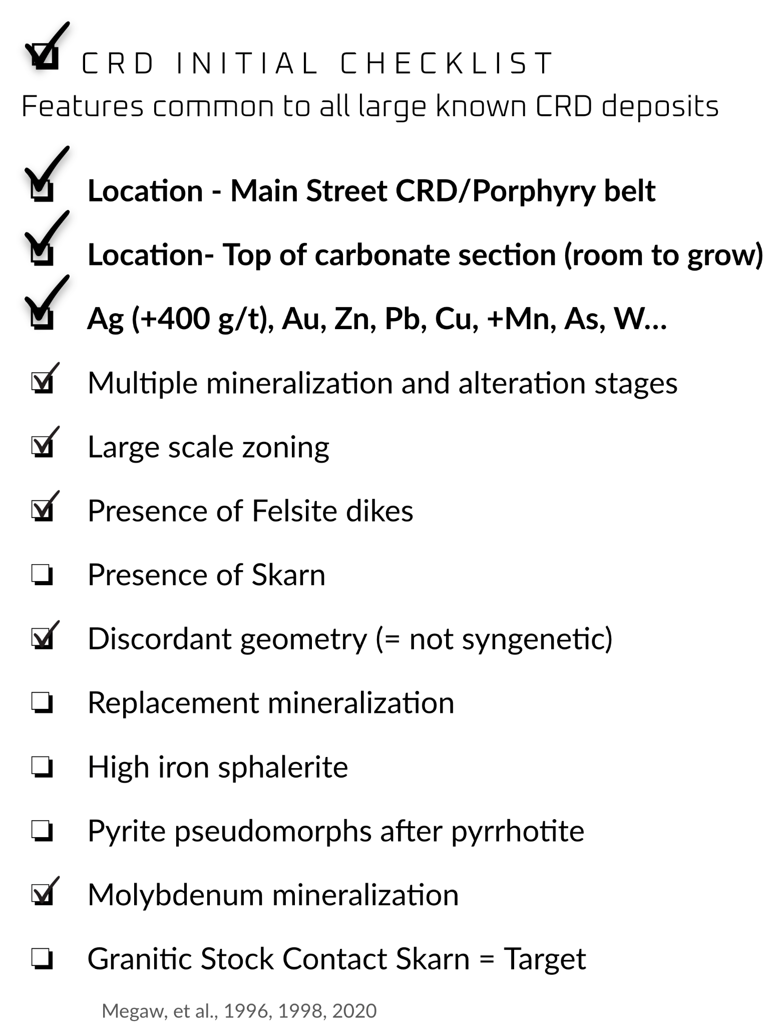 Figure 5. The CRD Initial Checklist, with the 13 key features common to all large known CRD deposits. Gryphon exhibits 8 out of 13 to date.