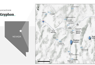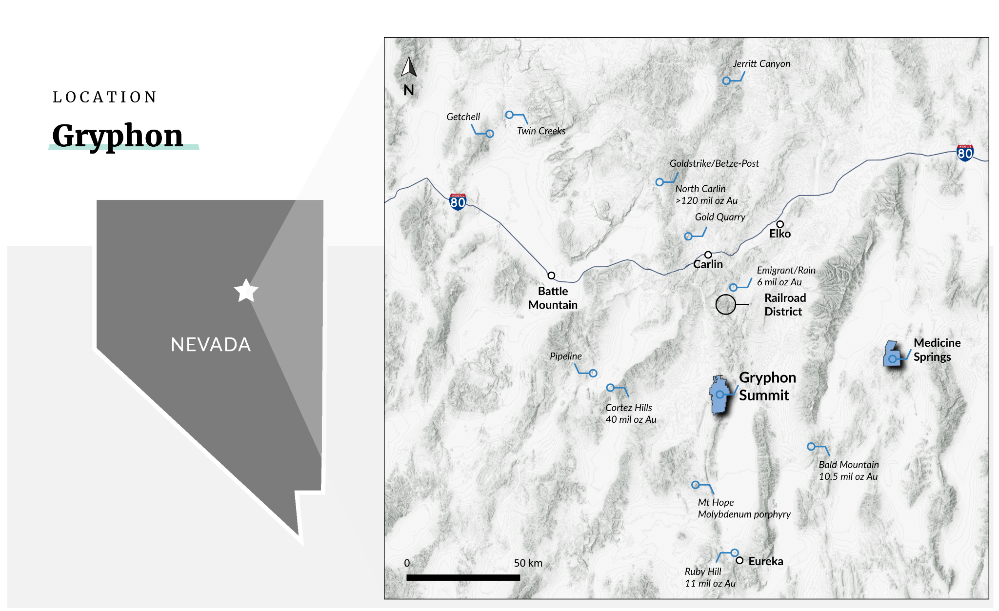 Figure 1. Gryphon Summit is located in Northeastern Nevada, 70 km NW of the Eureka district and 54 km from Carlin. The project is 73 km west of Reyna Silver's Medicine Springs CRD Project.
