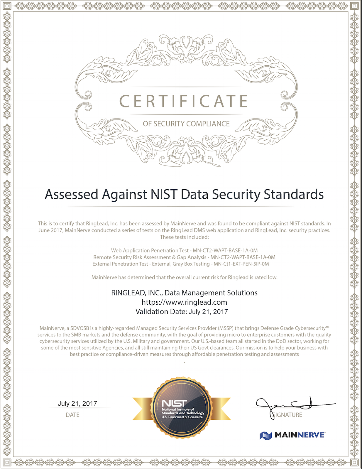 MainNerve, an industry-certified provider of comprehensive cybersecurity services, penetration testing, and compliance assessments and solutions, conducted a series of tests on the RingLead DMS web application and RingLead, Inc. security practices in July 2017. At the conclusion of testing, MainNerve determined that RingLead has successfully exercised all industry proven security measures. MainNerve has a long history of providing industry-leading, defense-grade cybersecurity services to the U.S. Government, as well as other notable companies like Sprint, Alaska Railroad Corp and Magnum Shooting Center.