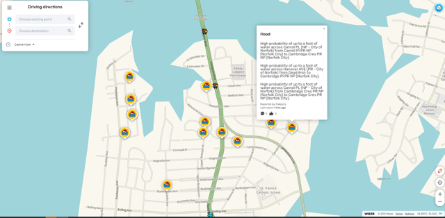 FloodMapp's groundbreaking forecast technology mixes tidal, riverine and rainfall data to create a rapid, real-time flood inundation model. The information is automatically layered with Norfolk's citywide road network in a geographic information system and sent to Waze in real time. Drivers using Waze receive pop-up icons and audio alerts to warn them about flooded streets along their route and help them avoid property and life-threatening hazards. Drivers can confirm flooding in the app, which helps validate FloodMapp's technology and makes future Waze alerts more accurate. The information will also be used for an automatic rerouting feature, which is currently under development.