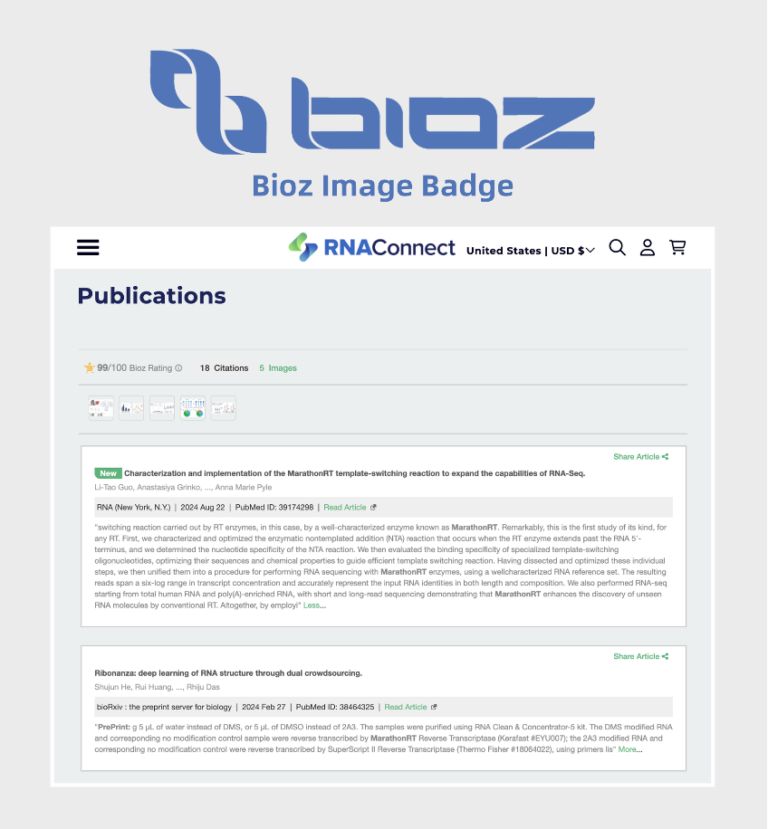Dr. Karin Lachmi, Chief Revenue Officer and Co-Founder of Bioz, added, “We are thrilled to integrate their cutting-edge RNA tools into our platform. The inclusion of Bioz Badges on their product webpages will provide researchers with valuable insights into the quality of their solutions. The citation in the RNA Society journal, RNA, further validates the significance of RNAConnect’s contributions to the field.”