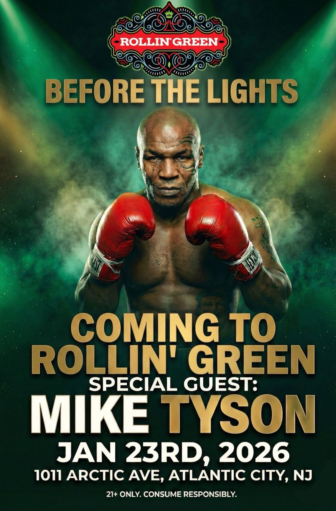 On Friday, January 23, at 3:00 PM, Mike Tyson is expected to drop-in for a brief visit at Rollin' Green as part of the dispensary's opening week. Rollin' Green is proud to carry Tyson 2.0, Mike Tyson's cannabis brand, which will be available in store. The visit comes during Rollin' Green's opening week as the dispensary opens its doors to the Atlantic City community.