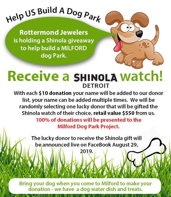 Right now, the retailer and BlingNThings, another local business, are giving one lucky winner a Shinola watch of their choice valued at $550. Those interested in entering the contest can stop by any Rottermond Jewelers location or visit Rottermond Jewelers’ website to donate $10. All of the proceeds from this giveaway will be presented to the Milford Dog Park Project for a dog park that is being proposed as a new development in the Milford community.