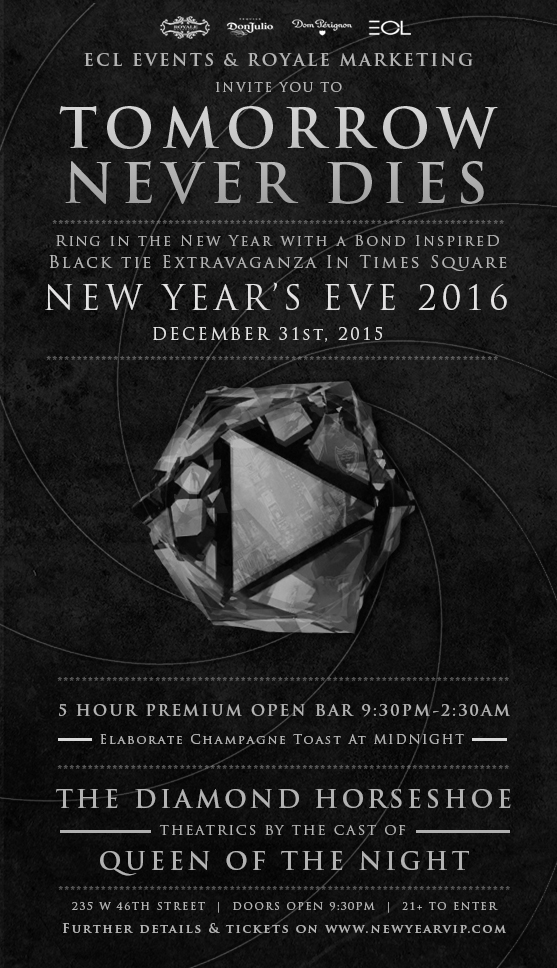 New York, NY, December 15, 2015 (Newswire.com) - Royale Marketing proudly presents Tomorrow Never Dies, an extravagant Bond-inspired New Year's Eve Gala at The Diamond Horseshoe in New York City's Time Square. New Year's Eve revelers will enter through the gates of The Diamond Horseshoe to follow James Bond on his journey to understand a cryptic message from his past, uncovering a sinister plot led by the Queen of the Night who has planted a device set to go off at midnight on New Year's Eve.