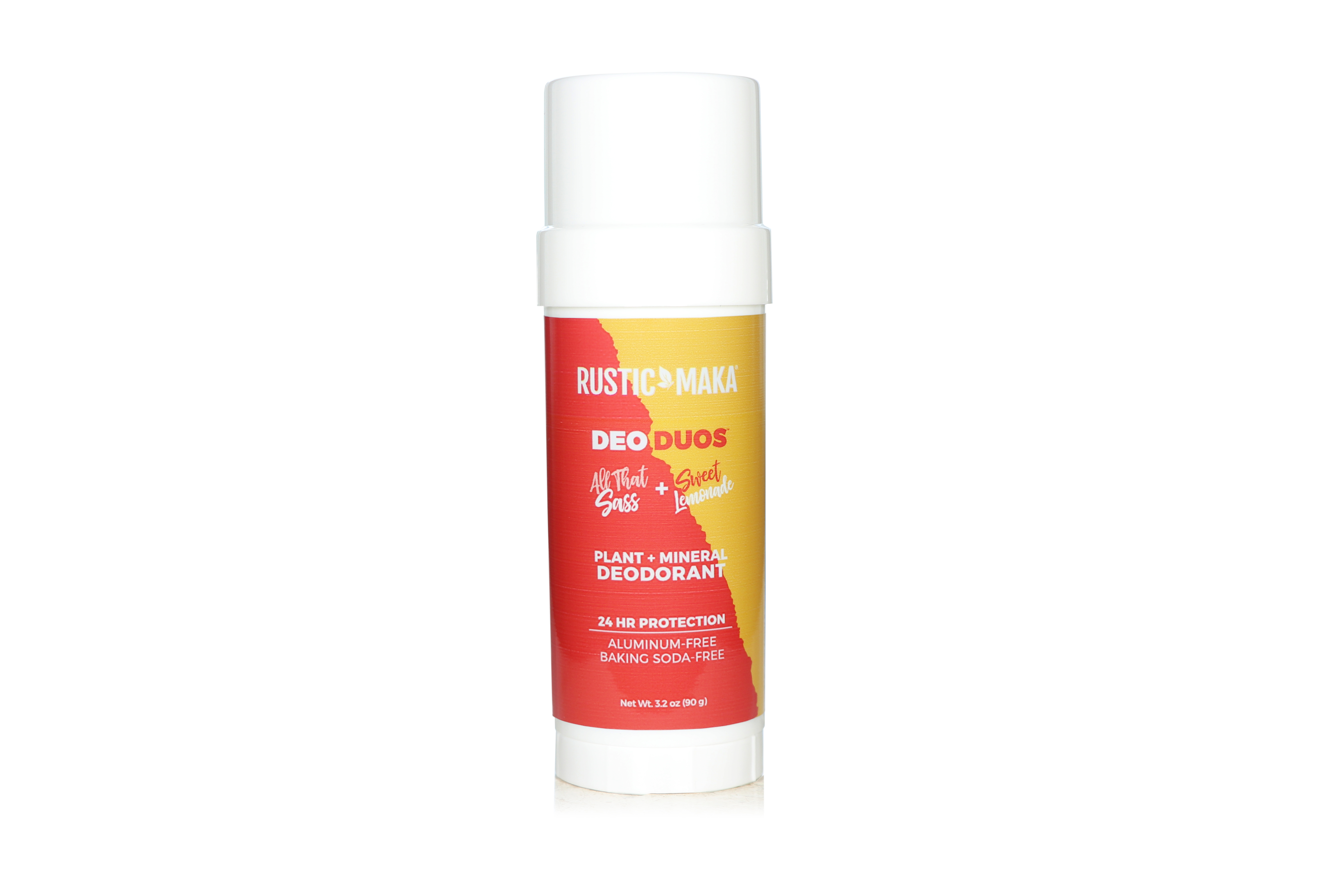 Rustic MAKA's one-of-a-kind DEO DUOS launch focuses on odor protection, nourishing, and balancing, with each deodorant stick carefully thought out to seamlessly fit into any health-conscious woman's, man's, or teen's holistic body care regimen. These are not your average deodorants, as both DEO DUO sticks are layered with two unique scents in one container, meaning you will never get bored again. Deo Duos ALL THAT SASS + SWEET LEMONADE (Baking Soda-Free) is an ideal everyday odor protector, while Deo Duos MYSTIC RIVER + CLEAN BLISS BiodomeProTM Prebiotic (Baking Soda-Free) is formulated with ingredients to help balance the skin's microbiome. Developed for seamless commercial distribution, each DEO DUO stick also features non-GMO and organic ingredients, is cruelty-free and vegan-certified, made in the USA and packaged in BPA-free + recyclable containers.