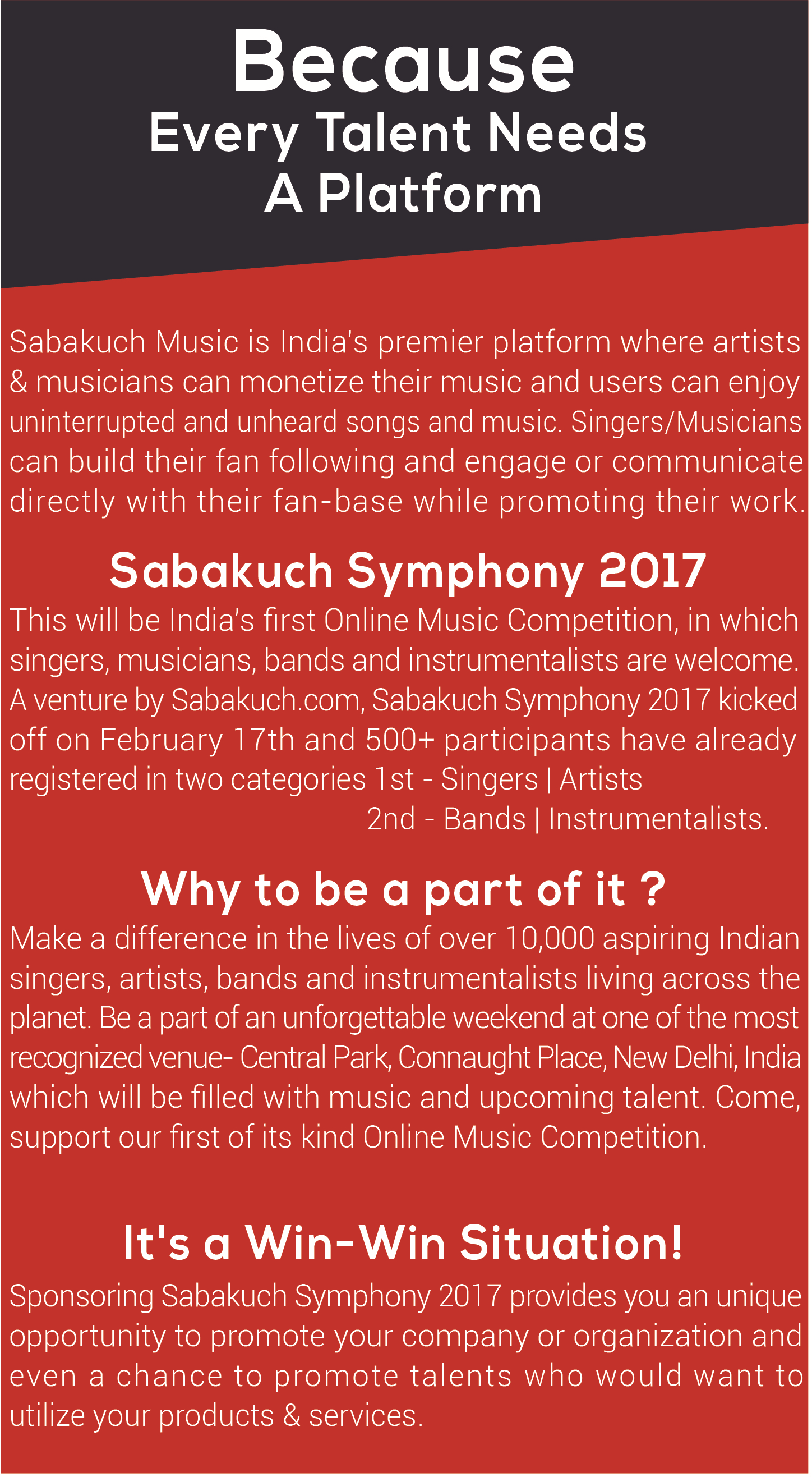 New Delhi, India, April 1, 2017 (Newswire.com) - Following the overwhelming response to Sabakuch Symphony 2017, the organisers have decided to extend the dates. After receiving several emails, calls and requests from not only hopeful participants, but also musical associations, the organisers saw it fit to allow a few more days, before closing the registration for Level 1.