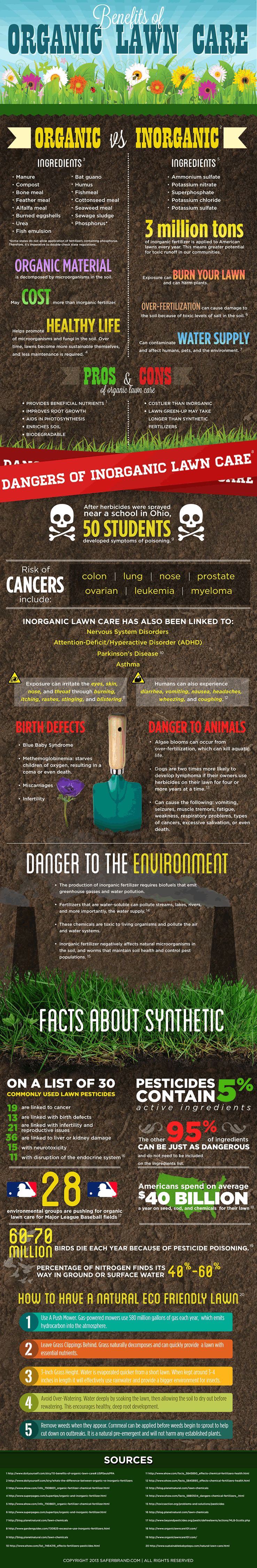 Safer Brand's first infographic outlines the benefits of using organic lawn care products such as improving root growth and enriching soil. The piece also covers the risks of using inorganic products such as the risk of diseases, the dangers to animals, and the dangers to the environment.