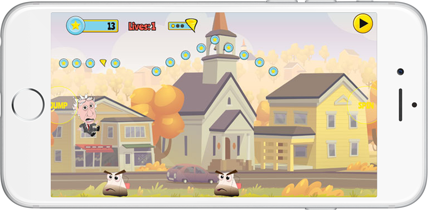 Unlike tradition or social media polls, the patent-pending POTUSpalooza gameplay poll is powered by casual iOS gamers. Gamers select the candidate of their choice, then run, jump and spin past a gauntlet of enemies and obstacles in the pursuit of votes. Every vote earned in the game, counts for the player’s candidate.