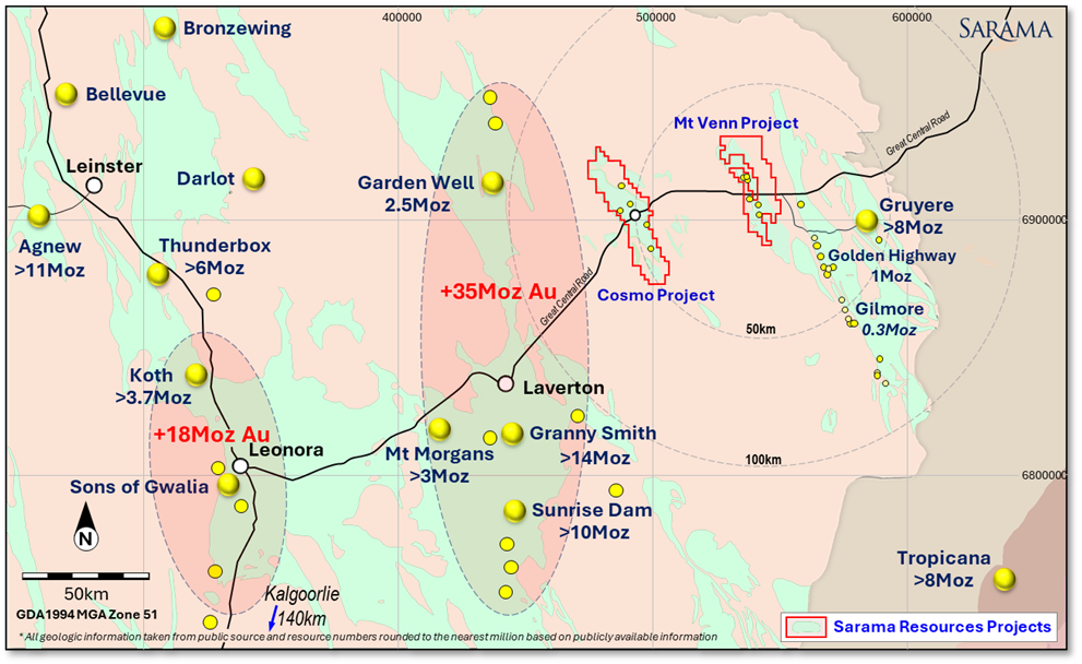 This follows Sarama's recent acquisition of a majority interest in the nearby Cosmo Project (refer Sarama news release 6 December 2024). Together the projects create a 1,000km² well-positioned and underexplored landholding in the Laverton Gold District which is known for its prolific gold endowment (refer Figure 1) and recent discoveries.