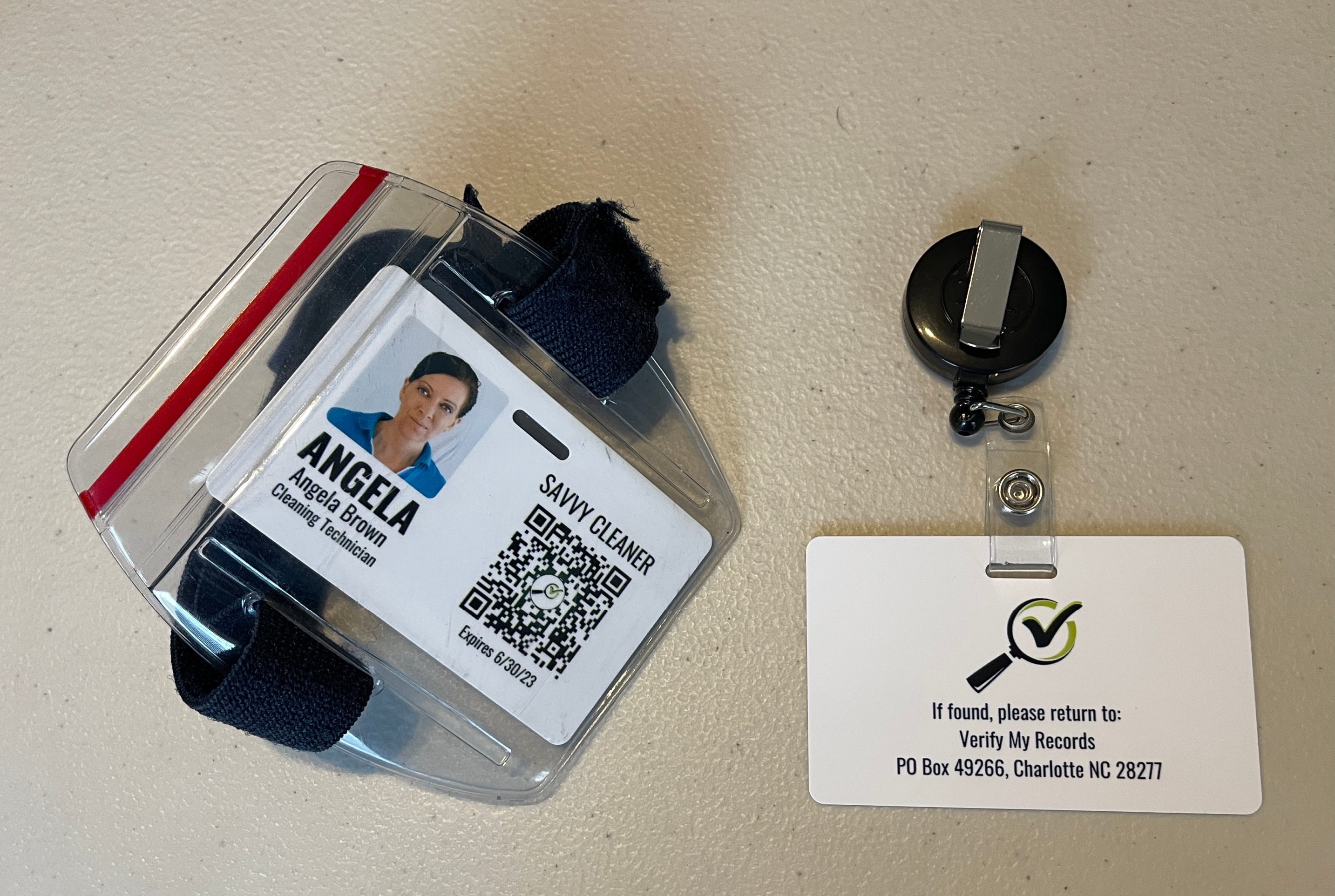 Verify My Records creates a custom page for each cleaning technician that includes any information that tech or their company wants to include in the verification process. This can be training, insurance, work eligibility, vaccinations, school diplomas, memberships to the chamber of commerce, or Better Business Bureau, etc. A QR code is created that links back to this page. While the QR code is added to the wearable photo ID badge, it can also be added to a cleaning company's website, marketing materials, invoices, cleaning worksheets, and business cards.