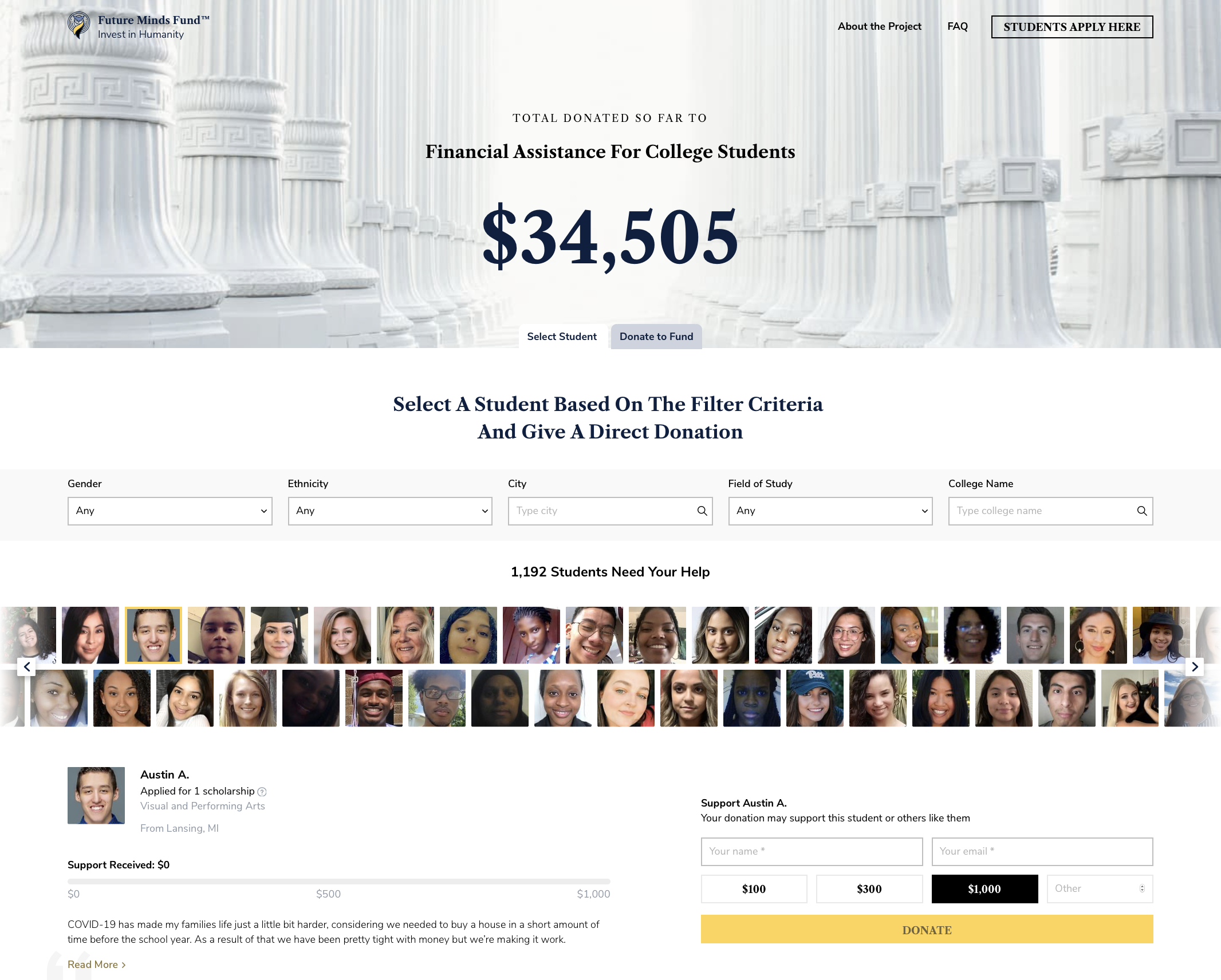 "I created the FutureMindsFund.org for you! Join me, because together we help thousands of students in need via our scholarship platform. A small amount goes a long way! Don't forget, students are our future, and they will solve today's problems. We need them.“
