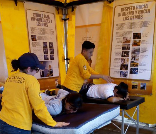 Because those receiving these assists often want to learn them to help their friends and families, the Volunteer Ministers provide training in these techniques in their bright yellow tent, along with seminars to help people overcome fear and cope with the dangerous environment.