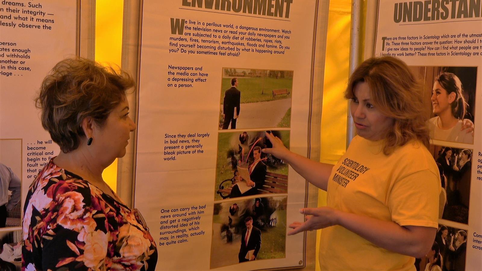 After the ribbon-cutting, guests were invited to enter the bright yellow Volunteer Minister tent for a Scientology assist or to tour the displays describing the 19 Scientology “Tools for Life.” Corresponding courses provide simple and practical technology through which anyone of any faith may learn to resolve difficulties and help others. The free online courses on the Volunteer Ministers website cover everything from relationship problems and job stress to the basics of organizing, raising children, how to help someone with a drug or alcohol problem, and resolving conflicts.