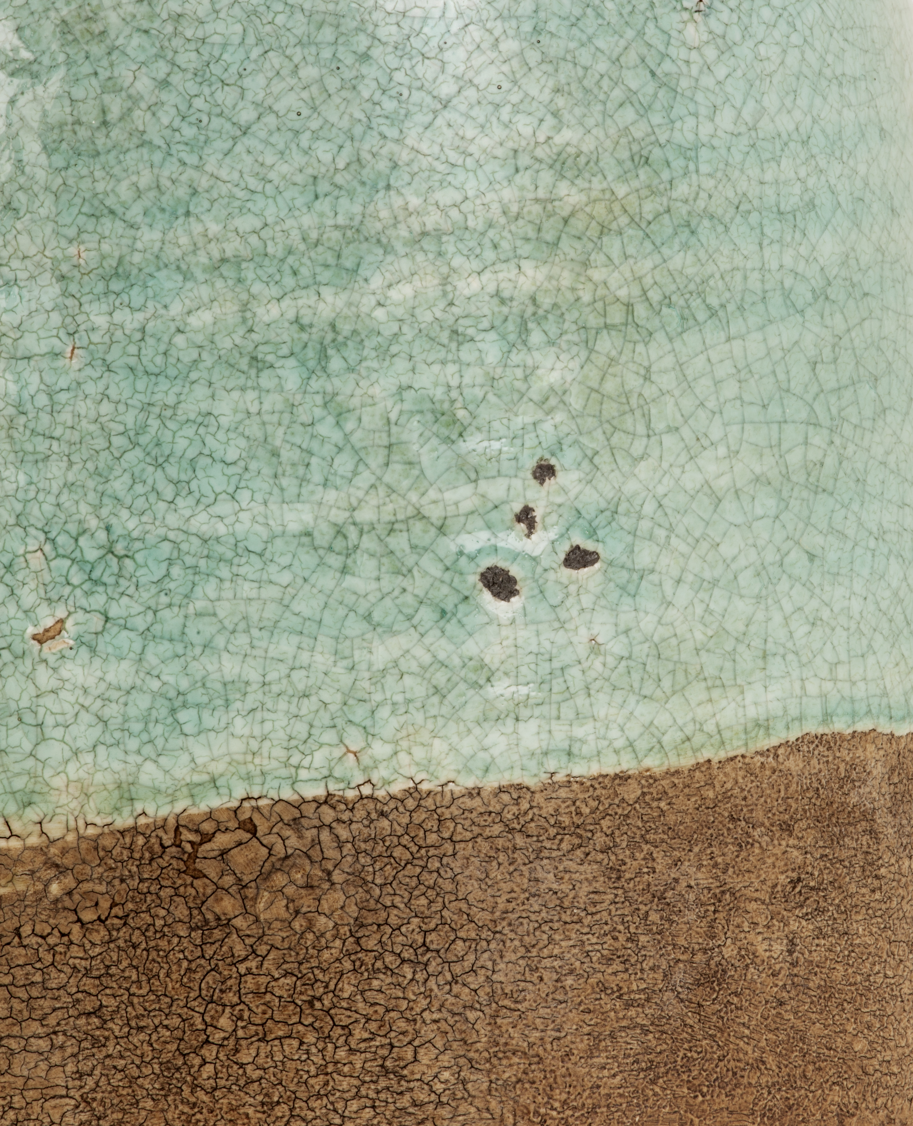 Photos published this week by the company reveal that their Batch #332 vase is similar to Gaia’s Batch #218 Tall hand Glazed Vase, in that a pale turquoise hue highlights both pieces. Also of note is the decision by Gaia’s potters to leave, in varying degrees, a strip of unpainted clay at the base of both vases.