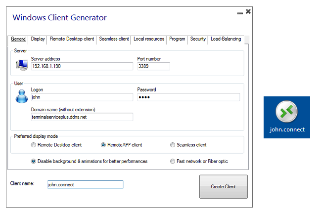 The most noticeable change is related to the Client Generator: this one has been redesigned to prevent any incompatibility with Windows Security and false/positive reactions on anti-viruses installed on client side. Thus, TSplus Portable Client Generator simplified the job of the Administrators by creating small (2KB) flat “.connect” files, which will be double-clicked by users to start their session (see screenshot). The only prerequisite is on the client side: to run a signed program named "Setup-ConnectionClient.exe”. This program is available on the server or by downloading it (here: https://dl-files.com/Setup-ConnectionClient.exe). The process and prerequisites are explained on the online documentation.