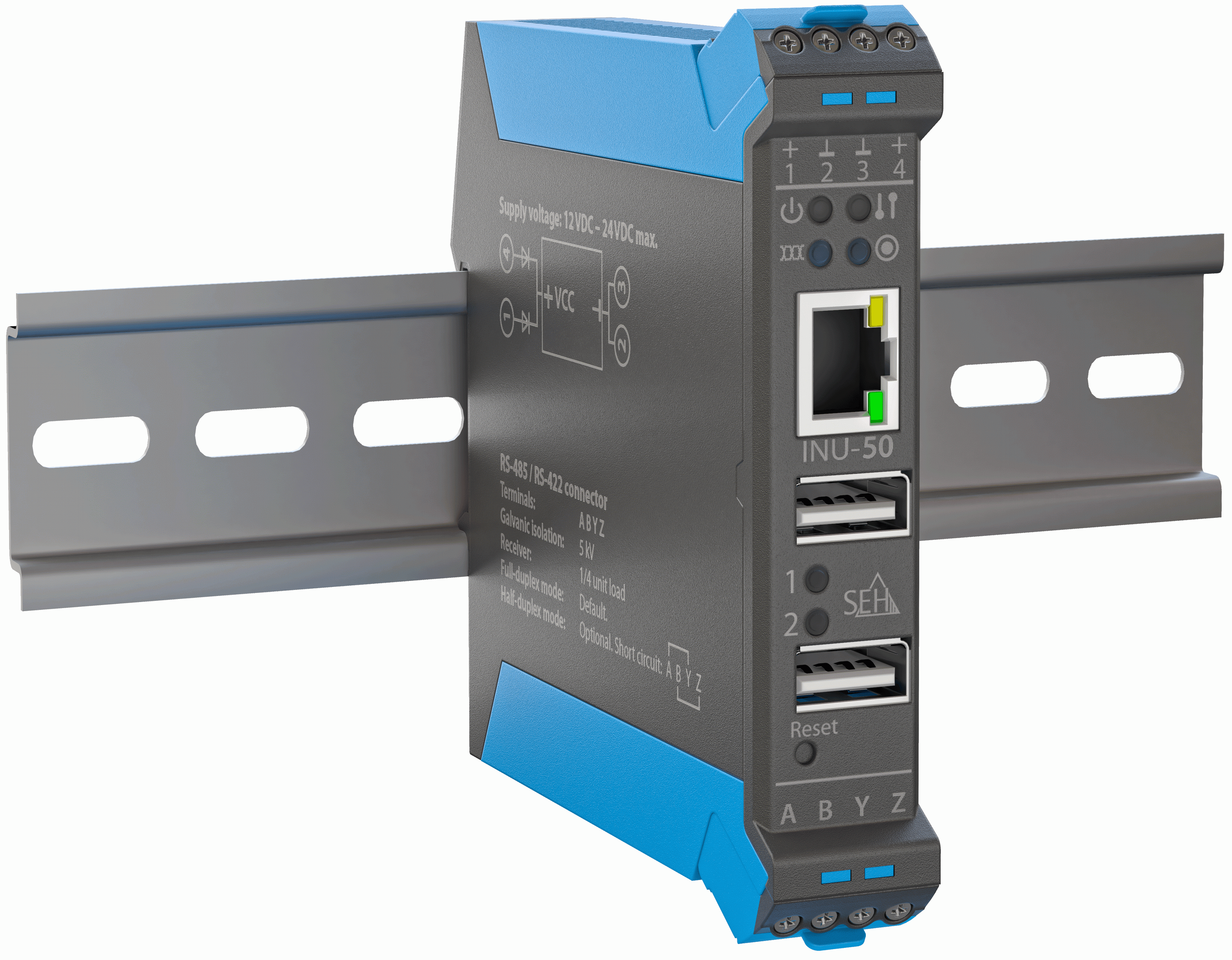 With the INU-50, SEH rounds off its portfolio of robust, DIN rail-mounted, industrial products. This includes the INU-100 USB device server with two USB 3.0 SuperSpeed ports, the SU-302 serial-to-USB converter and the IH-304 4-port USB hub.