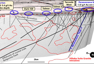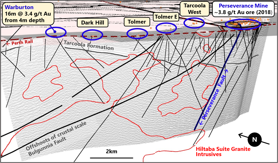 During 2020 Barton completed a high-definition reprocessing of historical seismic data around Tarcoola to better understand the local structural architecture.1 The results confirmed the location and orientation of the Perseverance Fault (which controls the mineralisation of the Perseverance Mine) and identified a system of major structures analogous to the Perseverance Fault across the historical Tarcoola Goldfield.2