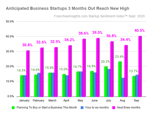 NORFOLK, Va., October 22, 2020 (Newswire.com) - In a remarkable turnabout, future business owners planning to start “this month” dropped, while startups planned “3 months out” reached the highest level on record in responses collected Sept. 23-30, 2020, for the FranchiseInsights.com Small Business Startup Sentiment Index™ (SSI).