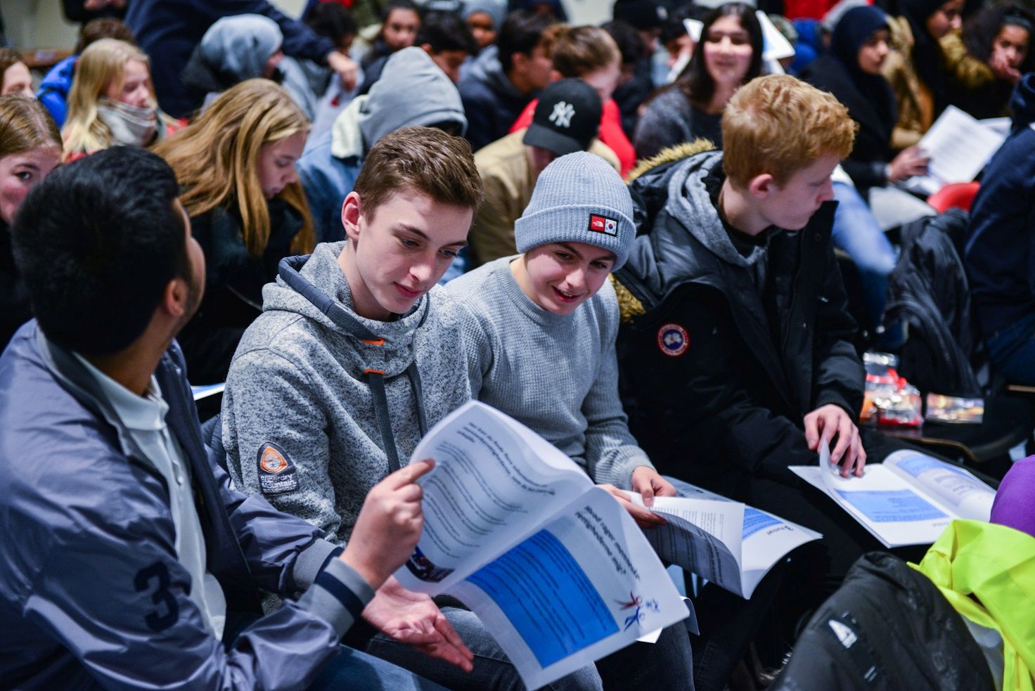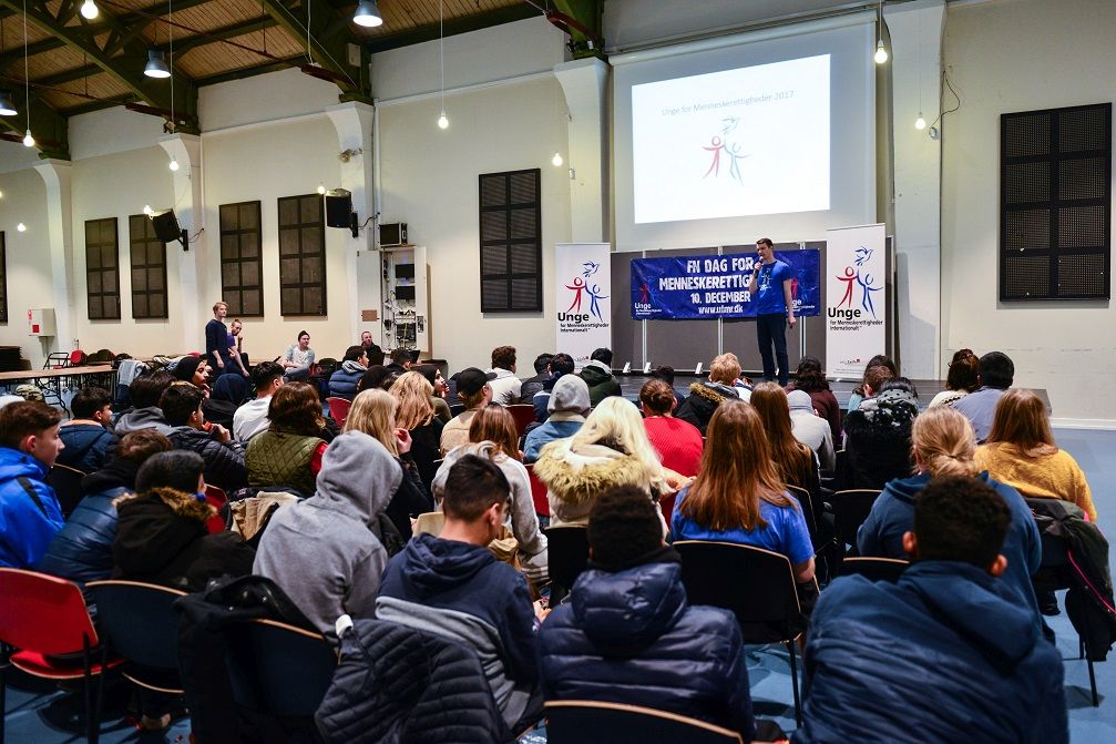 The walk ended at the Nørrebrohallen sports complex where students delivered freestyle raps and other performances highlighting the human rights they consider most important.