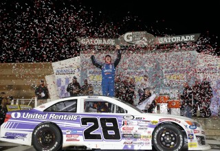 He started second in the #28 Cancer Awareness, United Rentals, A.M Ortega, Toyota led by crew chief Jeff Stankiewicz. He fell back a bit early in the event but charged his way to second by lap 21. After the first round of pit stops, he led until lap 44, when contact with a lapped car forced him to pit road. He regained the lead with 15 laps to go and never looked back as he won for the fourth time this year.