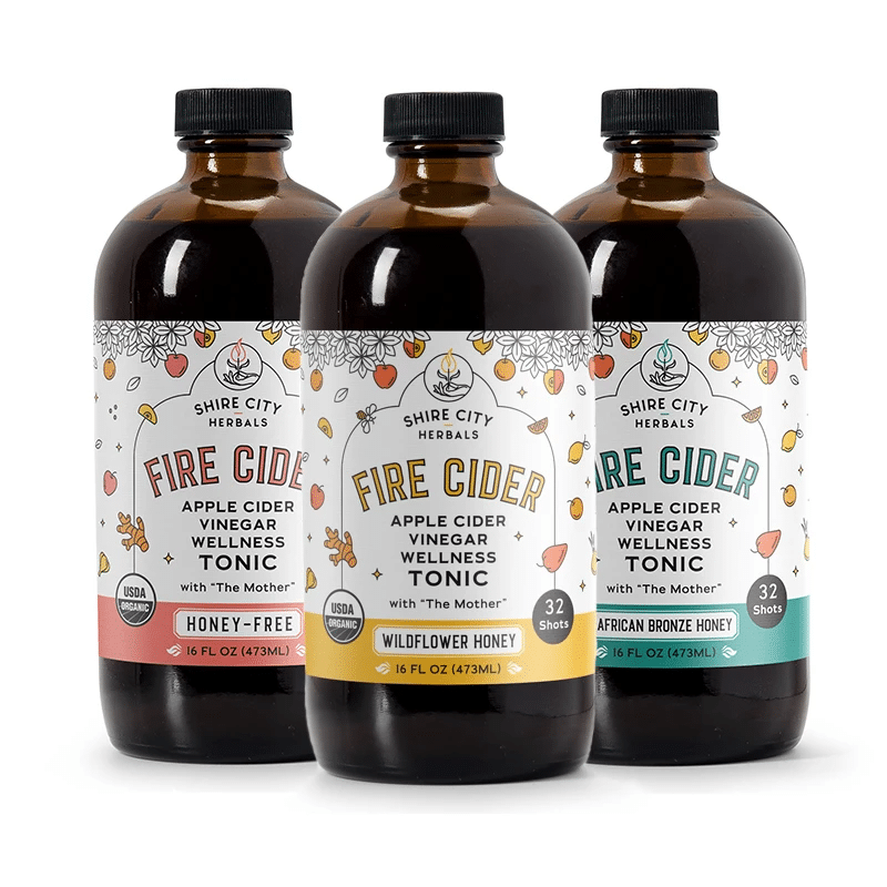 Since 2010, Shire City Herbals has handcrafted Fire Cider—our spicy Apple Cider Vinegar Tonic—with raw, whole, and certified organic superfoods including turmeric, ginger, lemon, garlic, honey and horseradish. We're proud to serve a broad range of intergenerational wellness enthusiasts, many of whom take a teaspoon or 1 oz shot as a daily ritual, and others who love it as a special condiment in salads, cocktails, and marinades. As a small family-owned business, we are committed to making the most potent functional tonics to support your daily wellness routine. Our certified organic farm partners agree that sun, unadulterated soil, and clean water create culinary marvels. We use their highest quality whole, raw, lovingly grown ingredients. We use fully recyclable shipping materials. Our bottles are reusable and recyclable.