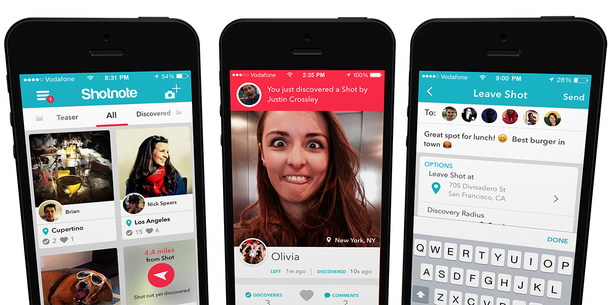 Shotnote is a unique photo sharing app with a simple and fun location-based sharing and discovery concept: With Shotnote users can take a photo, tag it to a specific location and leave it to their friends. Friends will discover the Shot once they end up close enough to that location and are then notified immediately.