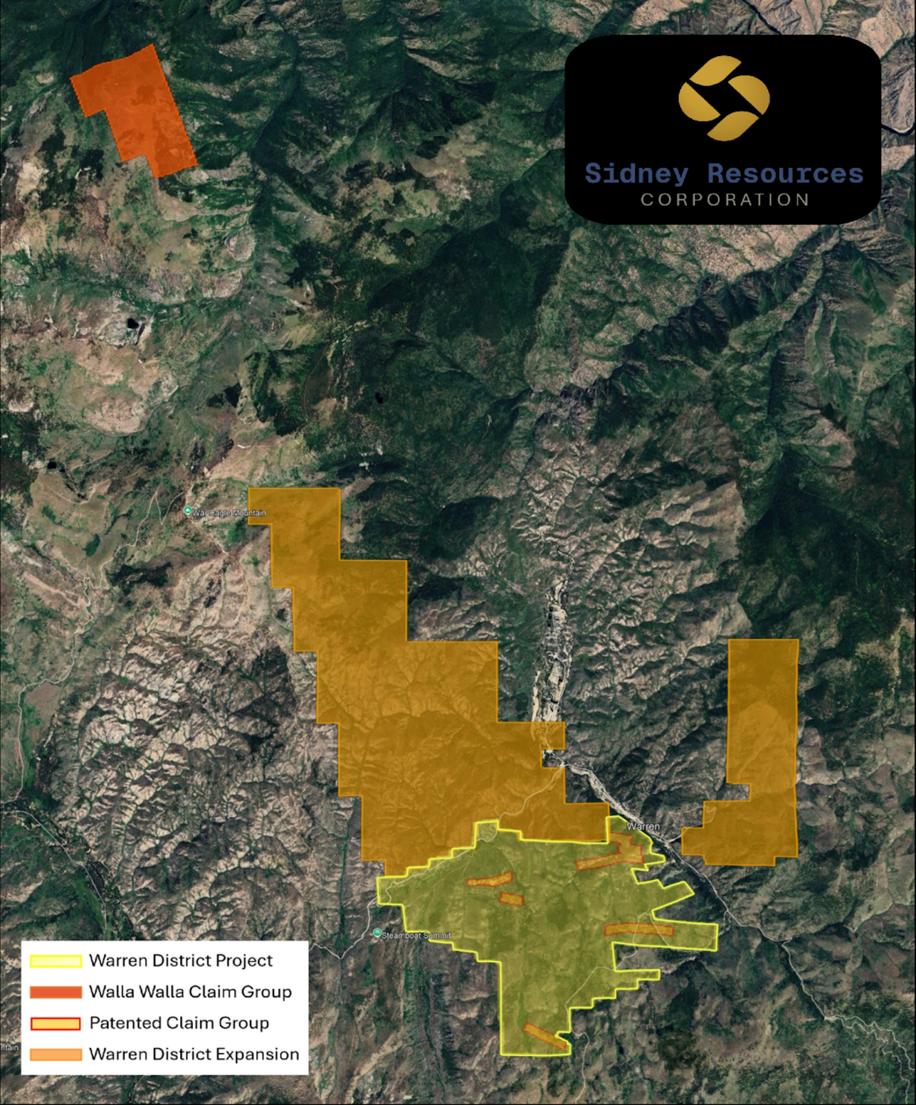 Figure 1 - Warren District Consolidated Land Position. Updated land position map highlighting Sidney Resources Corporation's dominant footprint in the Warren Mining District.