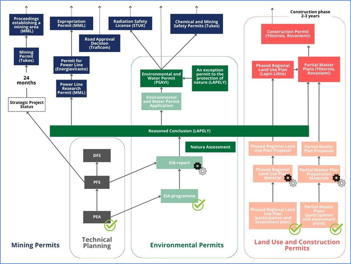 In Finland, environmental and other regulatory planning processes form the foundation for a structured and predictable permitting path required for sustainable mine development (Figure 1 is a graphical representation of the regulatory framework in place for mining projects within Finland). The EIA procedure lays the groundwork for moving the Rajapalot project through all future permitting requirements. This crucial process ensures not only the project's environmental responsibility but also facilitates meaningful stakeholder engagement in the development process. The EIA procedure includes two major phases: the Program phase (ie., "first phase") and the Report phase (ie., "second phase"). The Program, or "first phase" of the EIA procedure determines what information is needed to understand and address potential environmental and sociological impacts of the Rajapalot project, both now and into the future (ie., an outline of what will be studied and contained in the main EIA report, or "second phase"). The "second phase" consists of the EIA report addressing the requirements and likely significant impacts recognized in the "first phase" of the EIA Process.