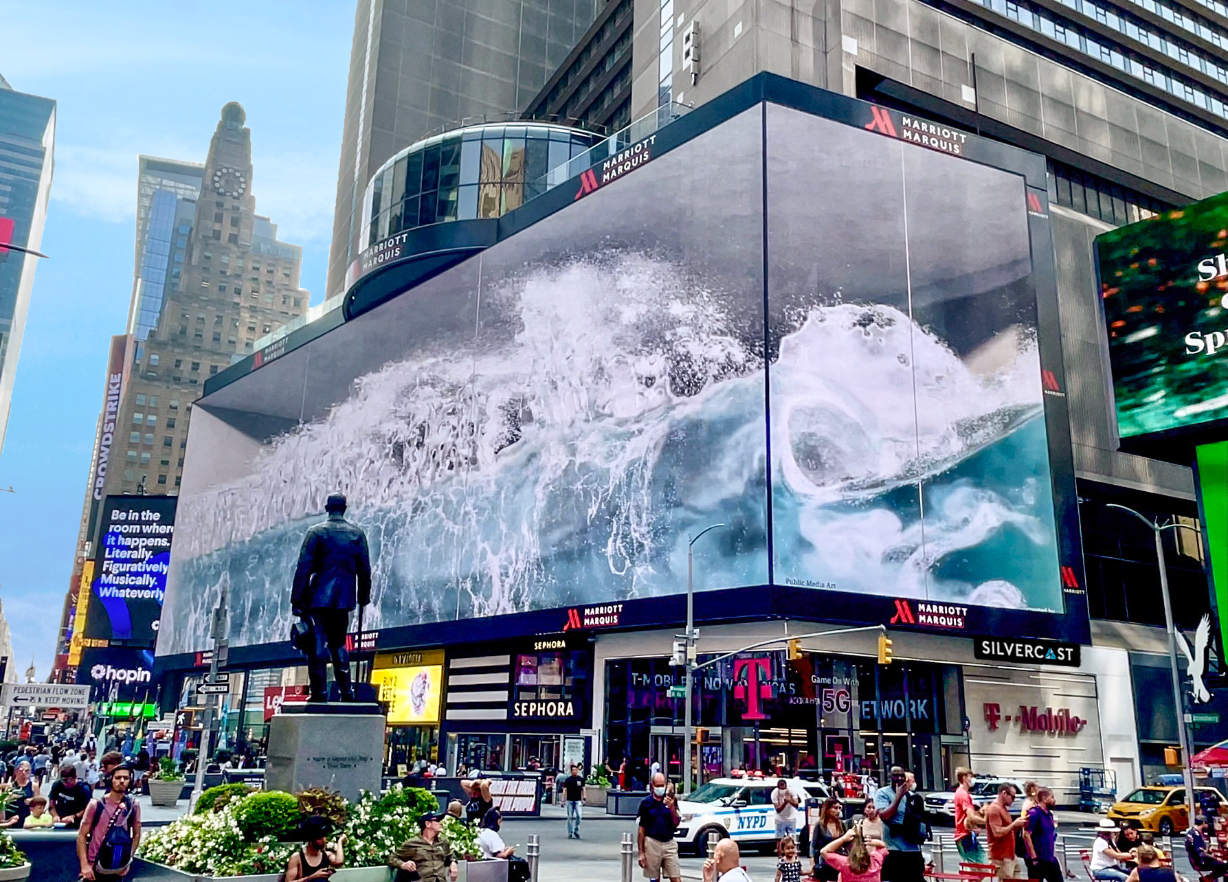 Appearing on SILVERCAST's 30,000 sq. ft. iconic Times Square digital spectacular known as "Big Kahuna" will be a media art execution titled WHALE. Illuminating the pedestrian plaza, the public media art display will transform the enormous screen into a hyper-realistic, undulating ocean environment occupied by a massive blue whale. The whale is made of water and will move freely and harmoniously among the waves.