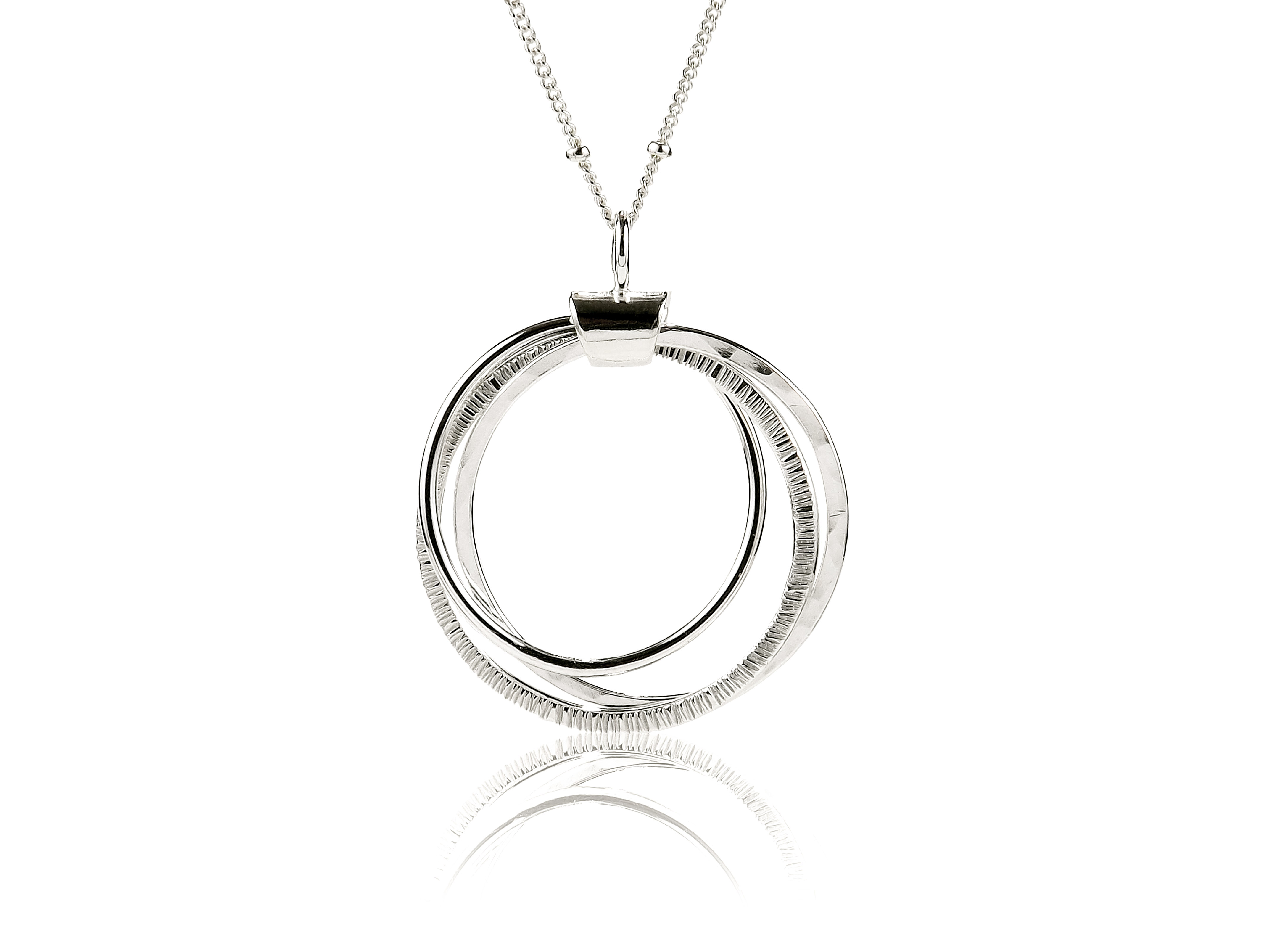 - Ophelia Necklace In Sterling Silver: three silver rings in interwoven designs. Enchantingly old-world.