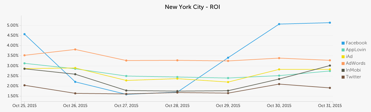 The company’s ROI reports provide a nearly unparalleled level of detail. Customers can analyze ROI by country, ad network or any other demographic such as interests or keywords. These queries can be further refined to easily and quickly identify non-performing marketing efforts and optimize accordingly. For example, an advertiser could could run a report to see their top performing ad networks’ ROI on an individual city level: