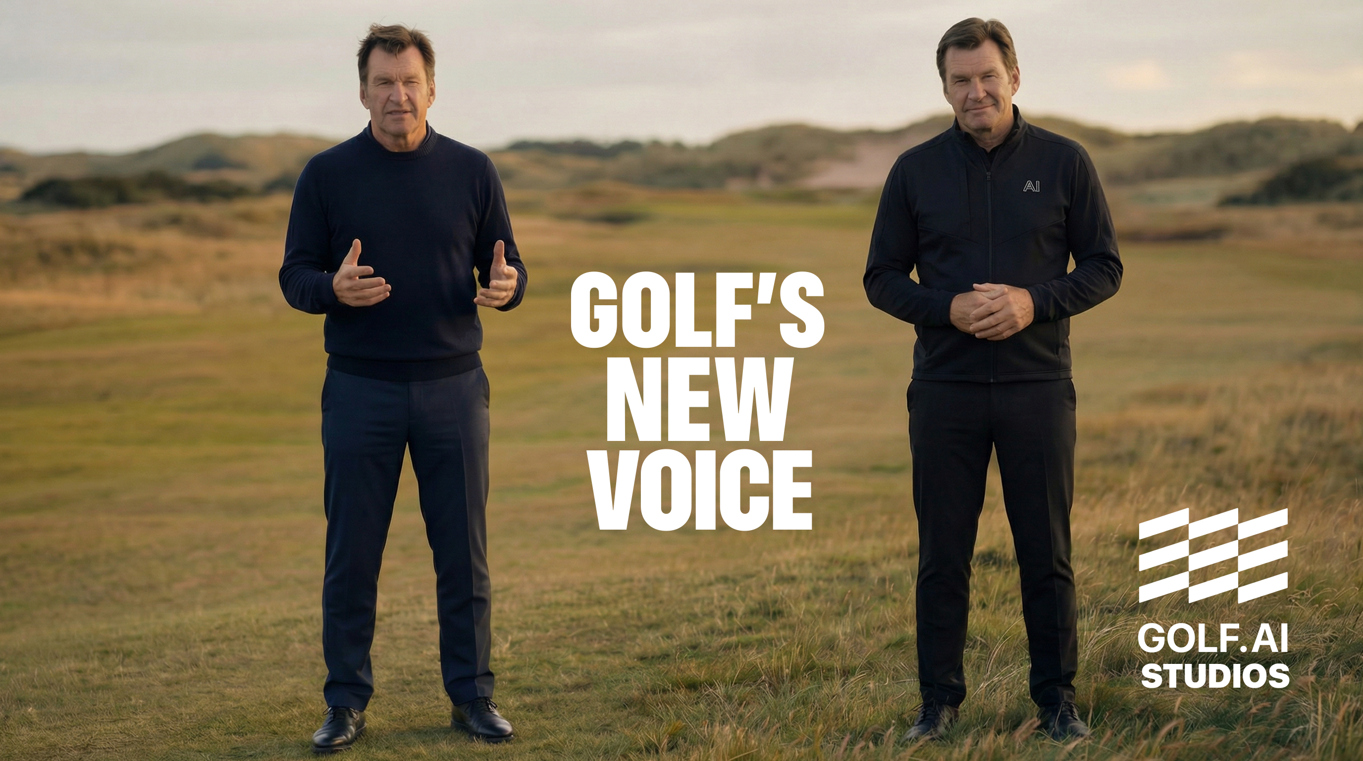 PHOTO CAPTION: An AI-generated image of Sir Nick Faldo's "Digital Twins" as they pose to promote the soon-to-premiere, groundbreaking online video series - "Golf's New Voice" - created by GOLF.AI Studios in partnership with Sir Faldo, a global ambassador of GOLF.AI.