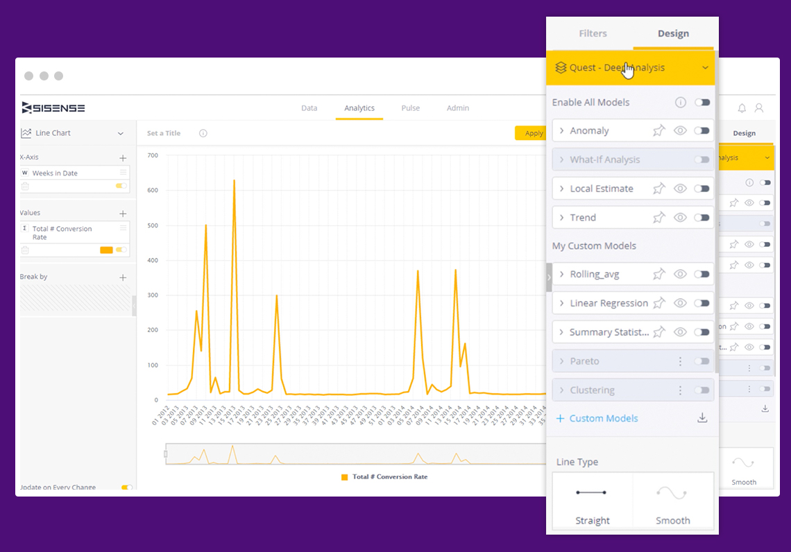 Sisense Quest allows customers to apply advanced analytic models to widgets, offering them a seamless, impactful insight-to-action experience. Sisense Quest provides the ability to deploy both out-of-the-box advanced statistical models and custom ML models using any time-series visualization with a single click. By offering business users the ability to independently explore and modify the models, users can gain a deeper understanding of the data and take action directly at the point of insight. This means both business users and organizations gain an advantage in making better decisions today that lead to better outcomes in the future.