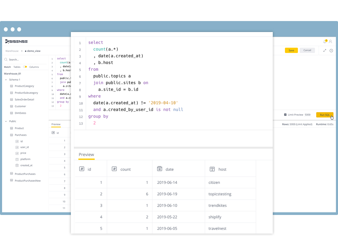 Periscope Data by Sisense offers a full suite of capabilities to empower cloud data teams using a combination of SQL, R & Python. Today’s announcement marks the first Periscope Data capability available directly from within the Sisense platform, the ability to leverage In-Warehouse Data Prep to materialize views into their cloud data warehouse.