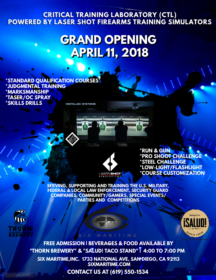 The grand opening is April 11, 2018: 11 a.m.-2 p.m. for VIPs, 4-7 p.m. for the public at Six Maritime's new San Diego office located at 1733 National Avenue in Barrio Logan. Afterwards, fleet units, law enforcement and security guard companies can book the six to 10 lanes at the Critical Training Laboratory, or qualify personnel in sustainment training on the M9 and M4 or practice shoot/don't-shoot scenarios and Judgmental Training, Run & Gun and small-unit tactics with the weapons they would have in the field, Robinson said.
