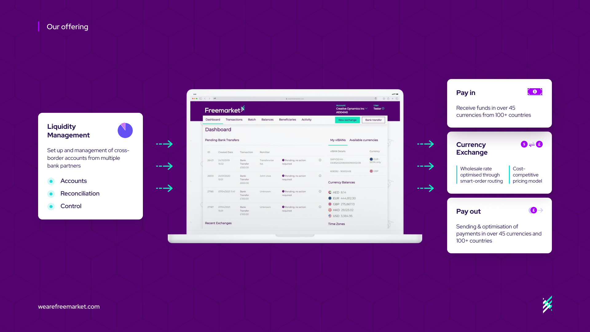 Freemarket works with businesses globally to accelerate their growth by giving them access to cross-border payments and currency exchange in over 40 currencies and across 100 countries optimised for their needs. Blending their own technology, insights, experience and industry connections with the best technology and banking service infrastructures available, the company securely automates the full lifecycle of payments from collection and receipt of funds to delivery.