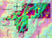 1433 - Johnson Gold: This occurrence yielded 0.965 g/t gold from a silicified rhyolite outcrop located approximately 2,800 meters northwest of the Harry Brook gold occurrence. The discovery was made by a DNR geologist during the 2005 summer mapping project.