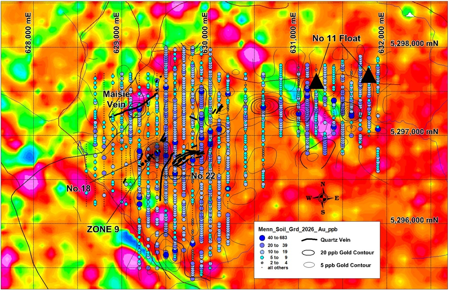 Director Jacques Turcotte stated: "Wow! Eighty percent of these samples contain gold as seen by the number of coloured dots. These beautiful maps show us the exceptional gold potential of Menneval. The blue dots show high gold lining up along aeromagnetic features and define exceptional drilling and trenching targets for upcoming 2026 campaign. Along with our known high grade gold veins open at depth and along strike these are high priority gold targets. The 2026 Menneval drilling program will be very exciting!"