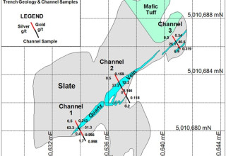 The Company has plotted the results of channel samples cut across the No. 1 vein. Eleven samples each 0.40 meters in length were cut in 3 channels that cross the vein and extend into the wall rock on both sides. Assays of the vein are 31.3 g/t gold, 12.3 g/t gold and 40.5 g/t gold plotted on the right side of the channel along with 63.30 g/t silver, 23.2 g/t silver and 25.1 g/t silver plotted on the left side of each channel as shown on Figure 2.