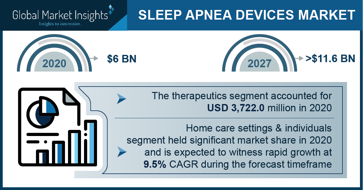 SELBYVILLE, Del., June 1, 2021 (Newswire.com) - According to the latest report, "Sleep Apnea Devices Market by Product (Therapeutics, Diagnostics), End-use (Home Care Settings & Individuals, Sleep Laboratories & Hospitals), Regional Outlook, Price Trends, Competitive Market Share & Forecast 2027", by Global Market Insights Inc., the market valuation of sleep apnea devices will cross $11.6 billion by 2027. High adoption of technologically advanced sleep apnea devices along with the increasing number of sleep apnea disorders across the globe will stimulate the market growth.