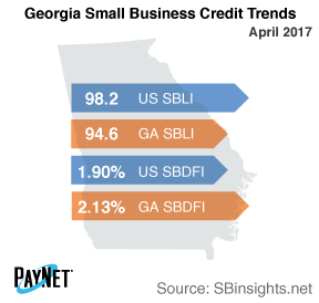 The PayNet Small Business Lending Index (SBLI) for Georgia was 94.6, down 1.6% from the previous month's level and 3.7% beneath this month's national SBLI level (98.2). Small business borrowers are behaving more cautiously by reducing investment.