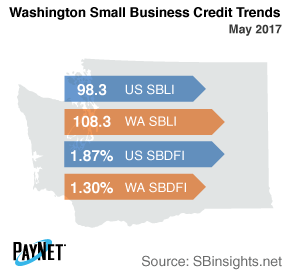 PayNet’s Small Business Default Index (SBDFI) for Washington registered at 1.30% after a 3 basis point reduction from April. Washington's SBDFI was 57 basis points below the national SBDFI level of 1.87%. Despite the favorable improvement last month, the index is basically unchanged from a year ago. Year-over-year, the national SBDFI rose 19 basis points, whereas Washington's SBDFI fell 2 basis points.