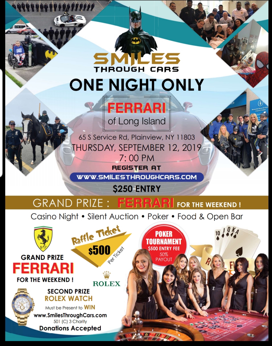 PLAINVIEW, N.Y., September 10, 2019 (Newswire.com) - On Thursday, Sept. 12, Smiles Through Cars will have their much-anticipated casino night launch event at the swanky Ferrari of Long Island at 65 S. Service Road, Plainview, NY 11803.